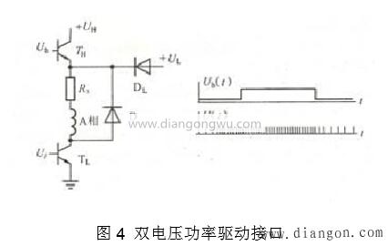 雙電壓驅(qū)動(dòng)器的電源接口如圖4所示。雙電壓驅(qū)動(dòng)的基本概念是在低(低頻段)以低壓UL進(jìn)行驅(qū)動(dòng),而在高速(高頻段)以較高電壓UH進(jìn)行驅(qū)動(dòng)。這種電源接口需要兩個(gè)控制信號(hào)。 Uh是高壓有效控制信號(hào),U是脈沖寬度調(diào)制驅(qū)動(dòng)控制信號(hào)。在圖中,功率管TH和二極管DL構(gòu)成功率轉(zhuǎn)換電路。當(dāng)Uh為低時(shí),TH截止,DL為正偏置,低壓UL為繞組供電。相反,當(dāng)Uh處于高電平時(shí),TH導(dǎo)通,DL反向偏置,并且高壓UH為繞組供電。這種電路可以使電動(dòng)機(jī)在高頻范圍內(nèi)具有更大的輸出,并在停止靜態(tài)鎖定時(shí)降低了功耗。