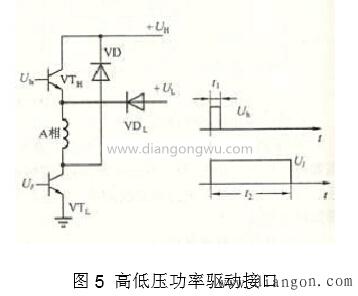 高壓和低壓電源驅(qū)動(dòng)器接口如圖5所示。高壓和低壓驅(qū)動(dòng)器的設(shè)計(jì)思想是使用高壓UH電源來增加導(dǎo)電相繞組的電流前沿,而與電動(dòng)機(jī)的工作頻率無關(guān),并且在該前沿之后,使用一個(gè)低電壓UL保持繞組電流。這種效果還改善了驅(qū)動(dòng)器的高頻性能,并消除了額外的損耗,因?yàn)椴恍枰獙㈦娮杵鱎串聯(lián)連接。高壓和低壓驅(qū)動(dòng)器電源接口還具有兩個(gè)輸入控制信號(hào)Uh和Ul,必須保持同步(如圖5所示),并且前沿同時(shí)跳躍。在圖中,高壓管VTH的導(dǎo)通時(shí)間t1不能太大或太小。如果太大,電動(dòng)機(jī)電流將過載,如果太小,動(dòng)態(tài)性能將不會(huì)得到很大改善。通常,它可以是1到3毫秒。 (當(dāng)該值等于電動(dòng)機(jī)的電氣時(shí)間常數(shù)時(shí)更合適。){{Paging}}