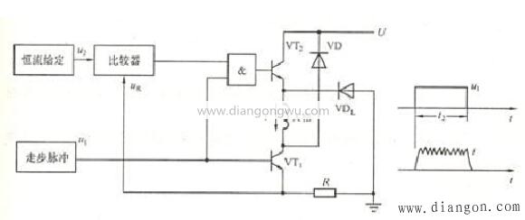 恒定電流驅(qū)動(dòng)器的設(shè)計(jì)思想是將導(dǎo)電相繞組中的電流保持在固定值,而與鎖定,低頻或高頻操作無關(guān)。確保電動(dòng)機(jī)具有恒定的轉(zhuǎn)矩輸出特性。這是一種電源接口,您可以更經(jīng)常使用它并獲得更好的效果。圖6是斬波器恒流電源接口的示意圖。在圖中,R是用于電流采樣的小型電阻器,稱為采樣電阻器。如果電流不大,則由工作脈沖同時(shí)控制VT1和VT2,并且當(dāng)電流超過給定的恒定電流值時(shí),VT2將被切斷,電源U將被切斷。由于電動(dòng)機(jī)繞組具有較大的電感,因此二極管VD續(xù)流以保持繞組電流,電動(dòng)機(jī)通過消耗電感的磁場(chǎng)能量來發(fā)電。此時(shí),電流根據(jù)指數(shù)曲線減小,并且相同的電流采樣值減小。當(dāng)電流小于恒定電流值時(shí),VT2接通,電源再次接通。重復(fù)地,電動(dòng)機(jī)繞組電流穩(wěn)定在由給定水平確定的值,從而形成小的鋸齒波,如圖6所示。