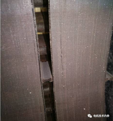 由于定子相對(duì)禁止的特點(diǎn)和提高工作效率的事實(shí),定子通風(fēng)槽通常采用工字鋼,大大提高了鐵芯的制造效率。但由于轉(zhuǎn)子旋轉(zhuǎn)的特殊性,轉(zhuǎn)子通風(fēng)槽對(duì)固定轉(zhuǎn)子通風(fēng)槽有特殊要求。有些企業(yè)使用工字鋼作為通風(fēng)槽,存在很大的質(zhì)量風(fēng)險(xiǎn)。在3354轉(zhuǎn)子高速旋轉(zhuǎn)的情況下,轉(zhuǎn)子疊片的較大離心力和轉(zhuǎn)子的振動(dòng)會(huì)引起斑點(diǎn)狀裂紋